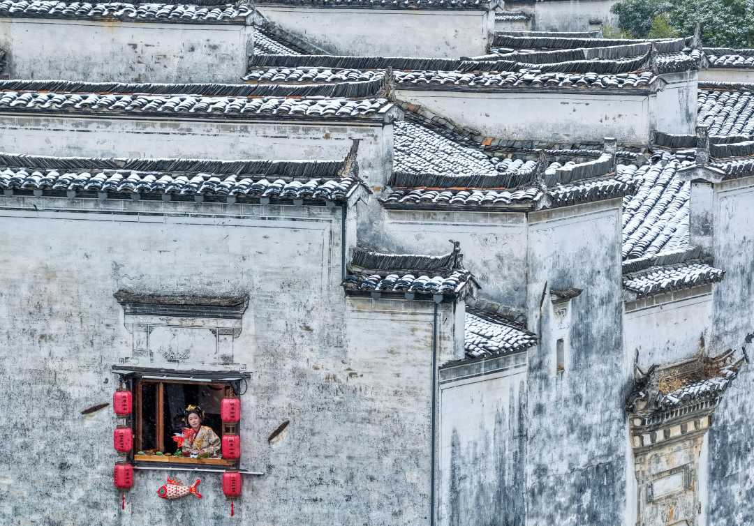 1月20日,在安徽省黄山市黟县宏村古村落拍摄的雪景。