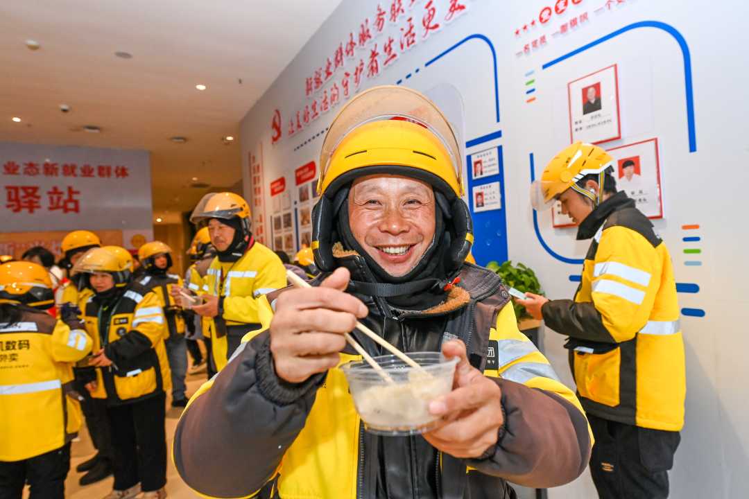 1月20日,江西省宜春市袁州区凤凰街道黄颇社区爱心驿站,外卖小哥在品尝热气腾腾的饺子。