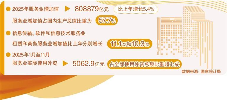党的十八大以来,我国生产性服务业规模持续增大,市场活力不断迸发。2023年,我国规模以上生产性服务业企业实现营业收入119万亿元,2020年至2023年年均增长12.1%,远高于同期GDP增速。2025年,信息传输、软件和信息技术服务业,租赁和商务服务业增加值比上年分别增长11.1%、10.3%,共拉动服务业增加值增长1.7个百分点。“十四五”以来,各地综合运用人工智能、大数据、工业互联网等技术,紧密结合自身工业基础,深化业务关联、促进技术渗透,推动产业链延链增值、智能化数字化水平不断提升,形成服务支撑制造、制造反哺服务的双向循环。