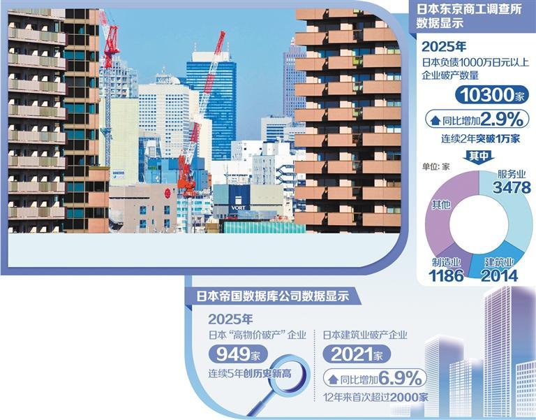 当前,日本许多企业仍因零利率贷款等衍生问题而深陷债务泥潭。日元疲软导致物价持续上涨,企业必须将利率上升、美国关税政策及国际形势影响等纳入考量。近日,日本首相高市早苗已经宣布将解散众议院,其罔顾日本经济困境和民众呼声,为巩固自身政权不惜打断国会进程的行为,将给日本政治带来“真空”,并将明确造成经济政策落地的滞后。伴随财年接近尾声,破产企业数量将逐步增加,业绩复苏缓慢的企业将逐渐失去动力,部分企业甚至放弃业务重组。有观点预测,2026年日本企业破产数量将继续增加。(经济日报驻东京记者 陈益彤)