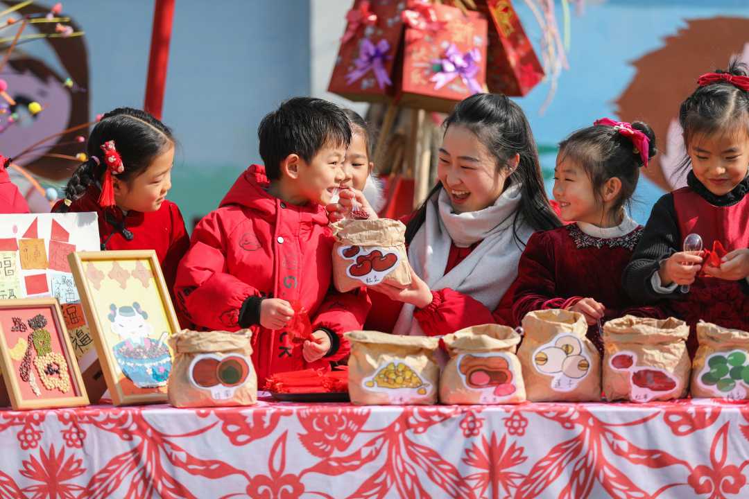 1月23日,安徽省黄山市示范幼儿园,老师为小朋友介绍制作腊八粥的食材,讲解腊八节的相关民俗知识。