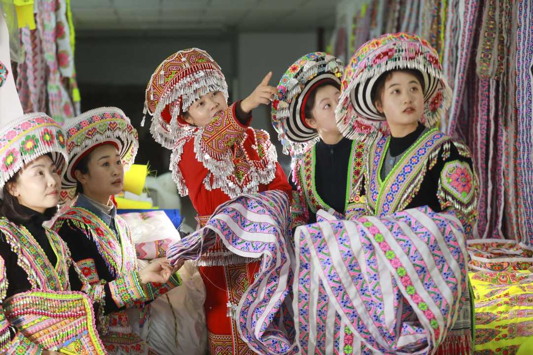 1月26日,贵州省黔西市铁石苗族彝族乡绣花车间,刺绣传承人陈敏(中)在给学员讲解苗族服饰的花样和分类。