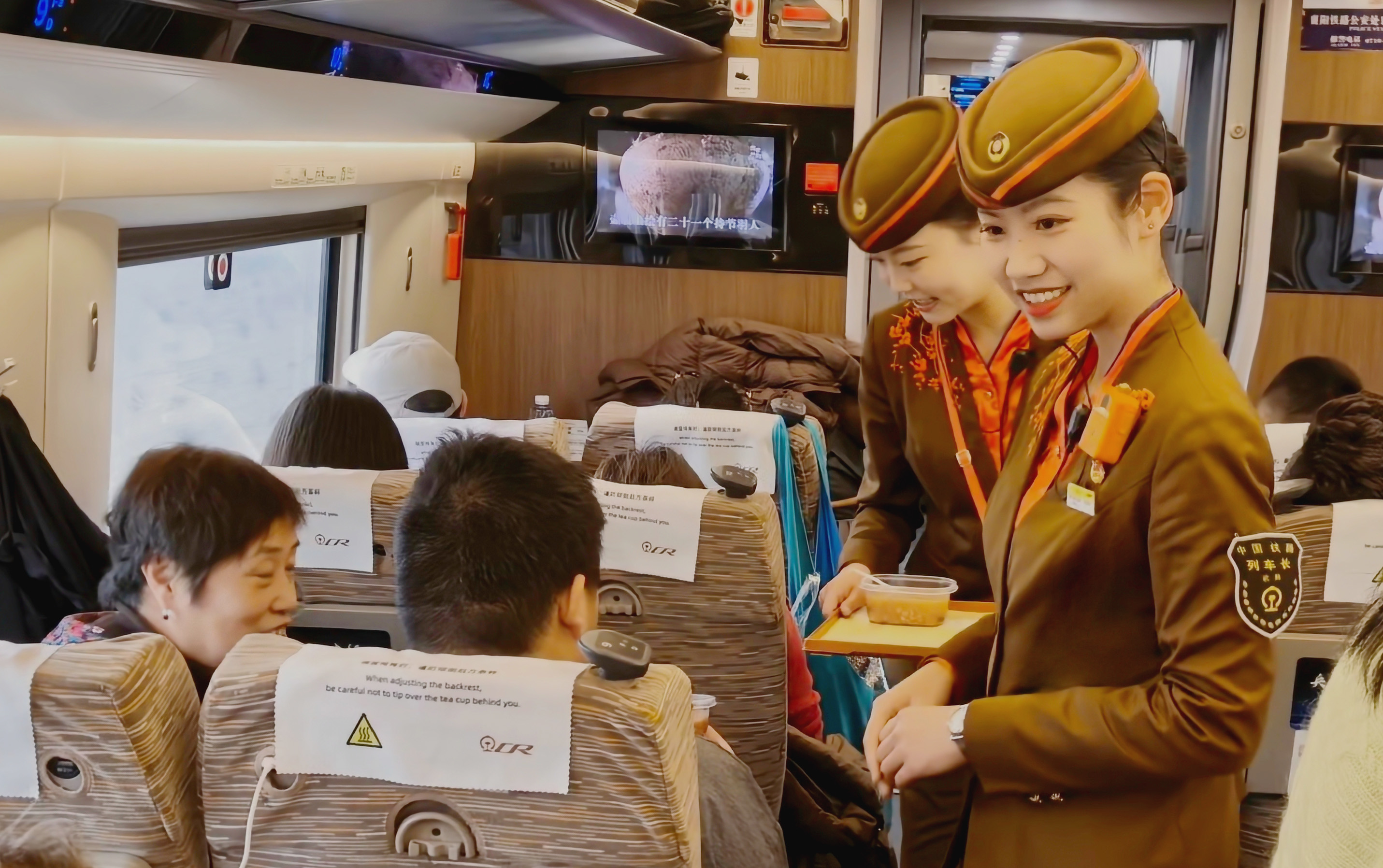 1月26日,北京开往武汉的G339次列车上,武汉北线动车组车间凤舞楚天乘务组列车员为旅客送上腊八粥。1月26日是农历腊八节,广大铁路职工在列车上开展腊八节主题活动,让旅客在旅途中感受浓浓温情。
