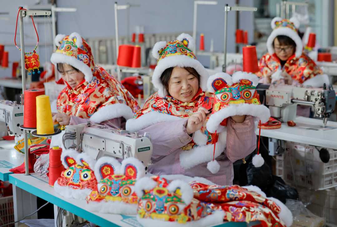 1月26日,山西省运城市万荣县一手工制品企业,员工在加工虎头帽,供应市场。