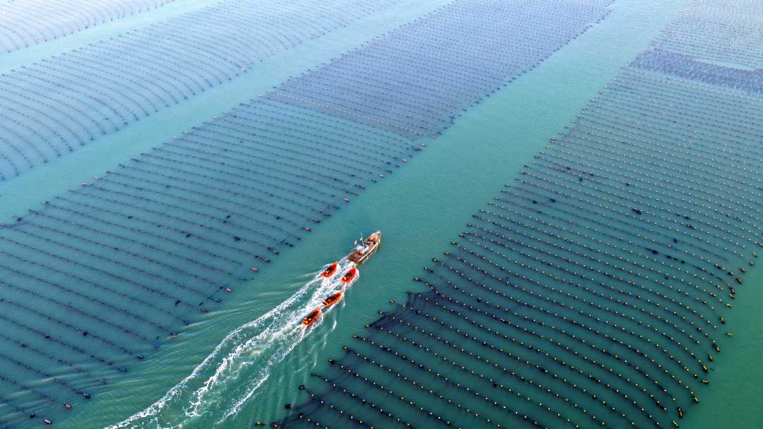 1月27日,山东省荣成市爱伦湾海洋牧场,养殖工人驾驶船只收获小海带。
