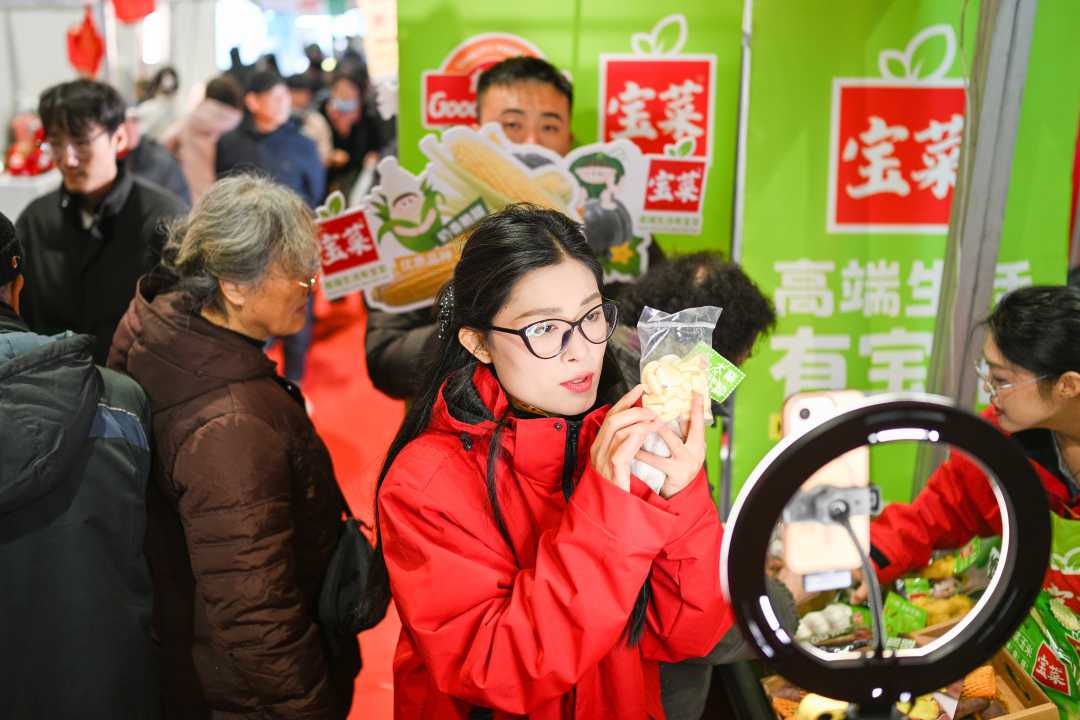 1月27日,江苏南京国际展览中心,商家在2026南京(全国)春节食品商品交易会上通过现场直播推销年货。