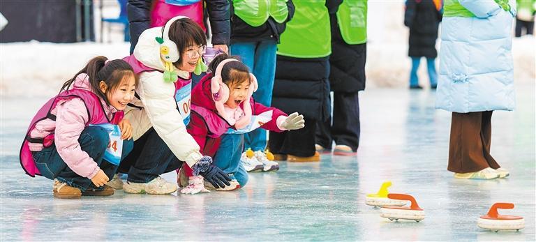 1月25日,内蒙古呼和浩特市大众冰雪季冰雪战队联赛活动现场,家长和小朋友在进行趣味冰壶比赛。内蒙古在冰雪季期间推出159项特色文旅活动,带动冰雪经济持续升温。丁根厚摄(中经视觉)