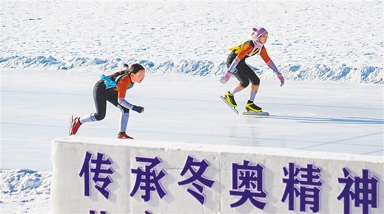 1月12日,新疆昌吉回族自治州奇台县第五中学冰场,运动员在比赛中你追我赶。昌吉州积极推进冰雪项目进校园,激发青少年对冰雪运动的热情。何 龙摄(中经视觉)