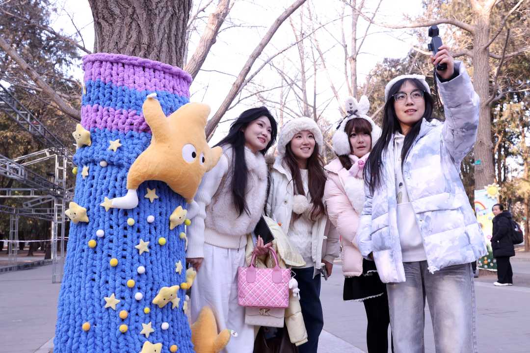 新春佳节将至,北京地坛公园银杏大道的银杏树披上五彩手工编织“彩衣”。这些“树衣”由北京电视台创意发起,残联与社区携手织就,件件手工缝制、满含爱心,一针一线的暖意凝作新春美好祝福,融入园林景致,为公园增添浓浓年味儿,吸引市民游人驻足打卡、拍照留影。