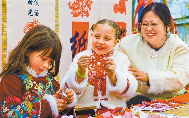 1月24日,安徽省黄山市南溪南村,外国小朋友在体验非遗剪纸。施亚磊摄(中经视觉)