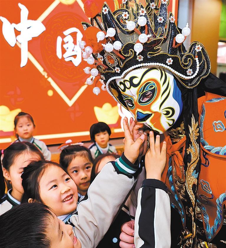 1月26日,山东省枣庄市,小朋友和川剧演员互动。孙中喆摄(中经视觉)