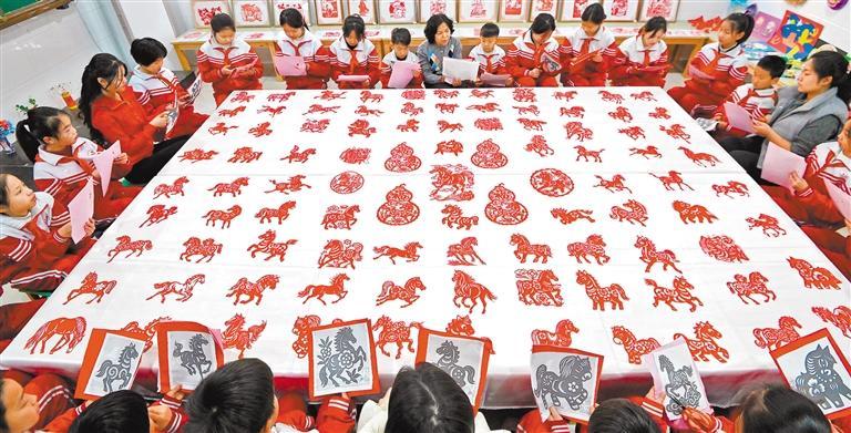 1月15日,河北省邯郸市磁县第四实验小学,师生在创作马年主题剪纸作品。郝群英摄(中经视觉)