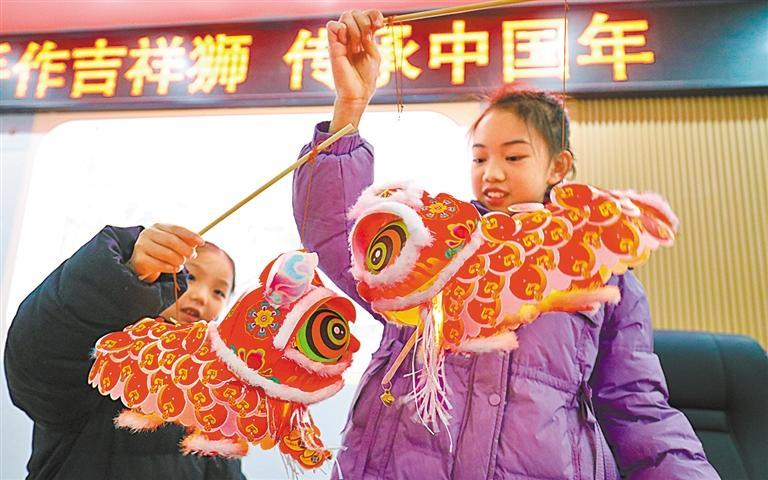 1月25日,重庆市高新区虎溪街道学成社区举办“手作吉祥狮 传承中国年”亲子手工活动。孙凯芳摄(中经视觉)