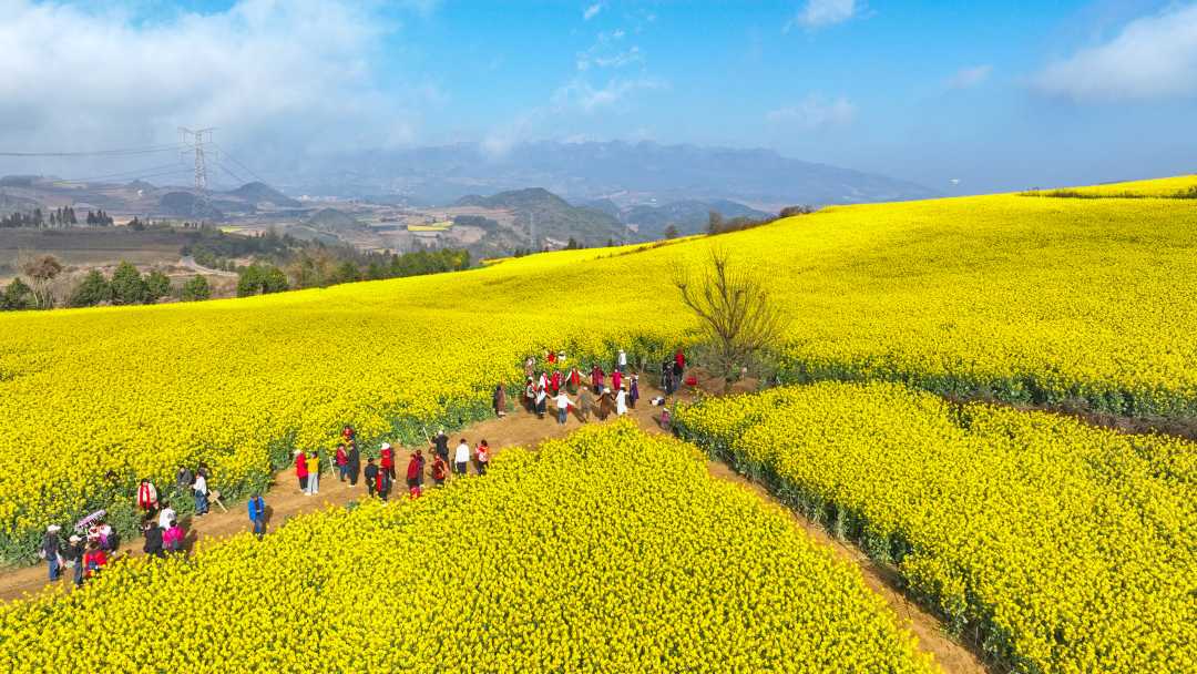 1月29日,云南省红河哈尼族彝族自治州蒙自市冷泉镇,万亩油菜花相继绽放,吸引游客前来赏花游玩。