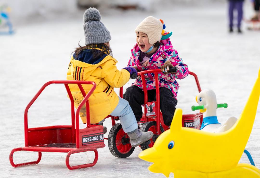 1月30日,小朋友在内蒙古呼和浩特市东河冰雪场体验滑冰车,享受冰雪乐趣。