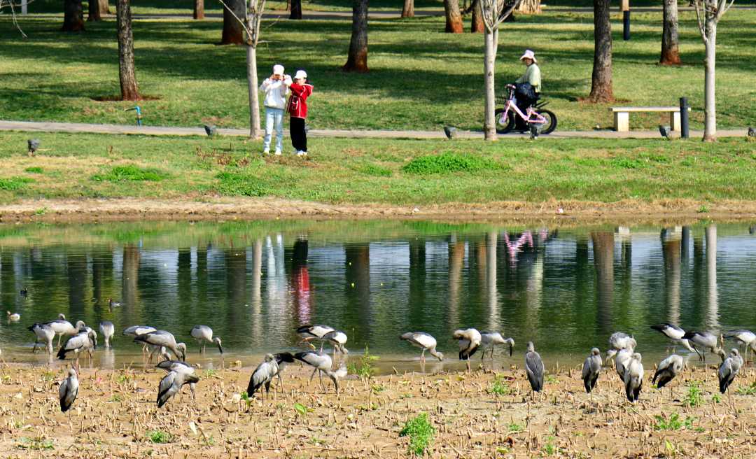 2月1日,云南省弥勒市甸溪河湿地公园,一群钳嘴鹳在河边觅食、嬉戏,为公园增添一道亮丽生态风景