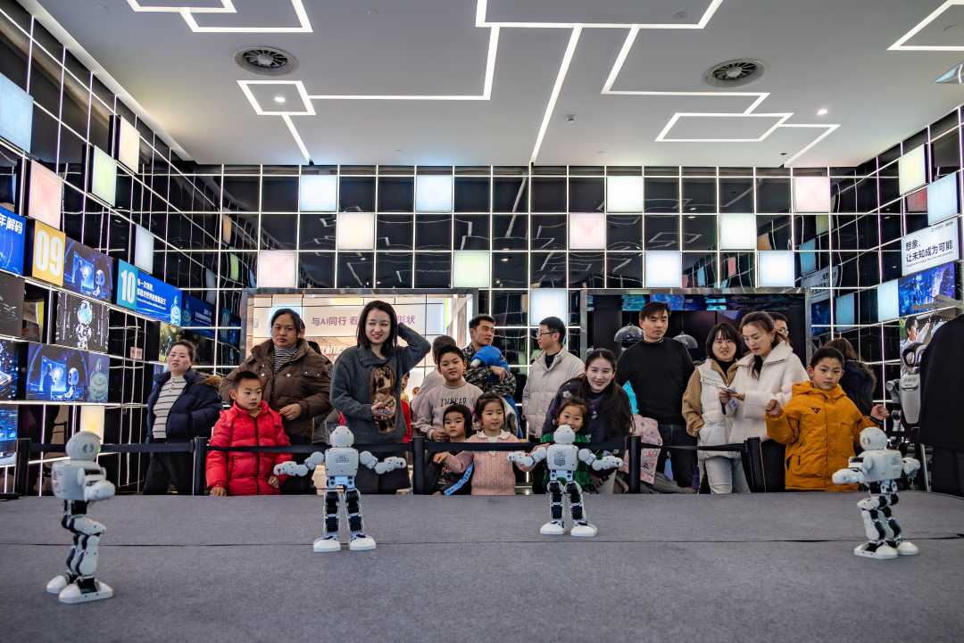 2月1日,安徽省合肥市包河区安徽创新馆内,家长带着孩子观看舞蹈机器人表演。