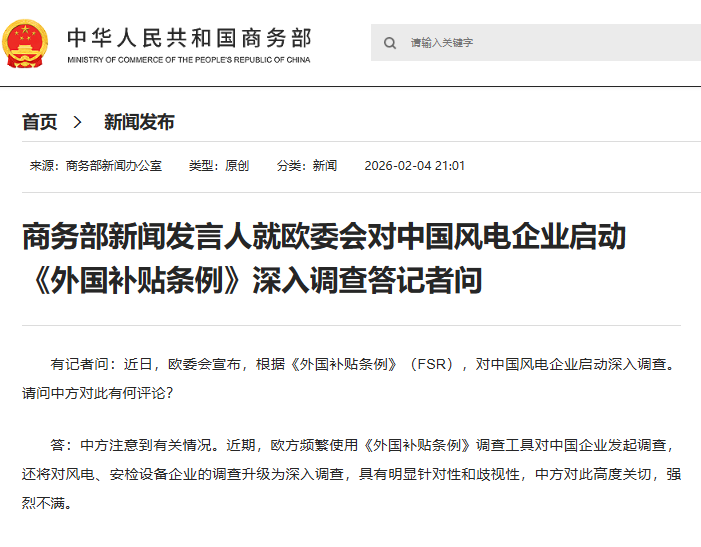 有记者问:近日,欧委会宣布,根据《外国补贴条例》(FSR),对中国风电企业启动深入调查。请问中方对此有何评论?