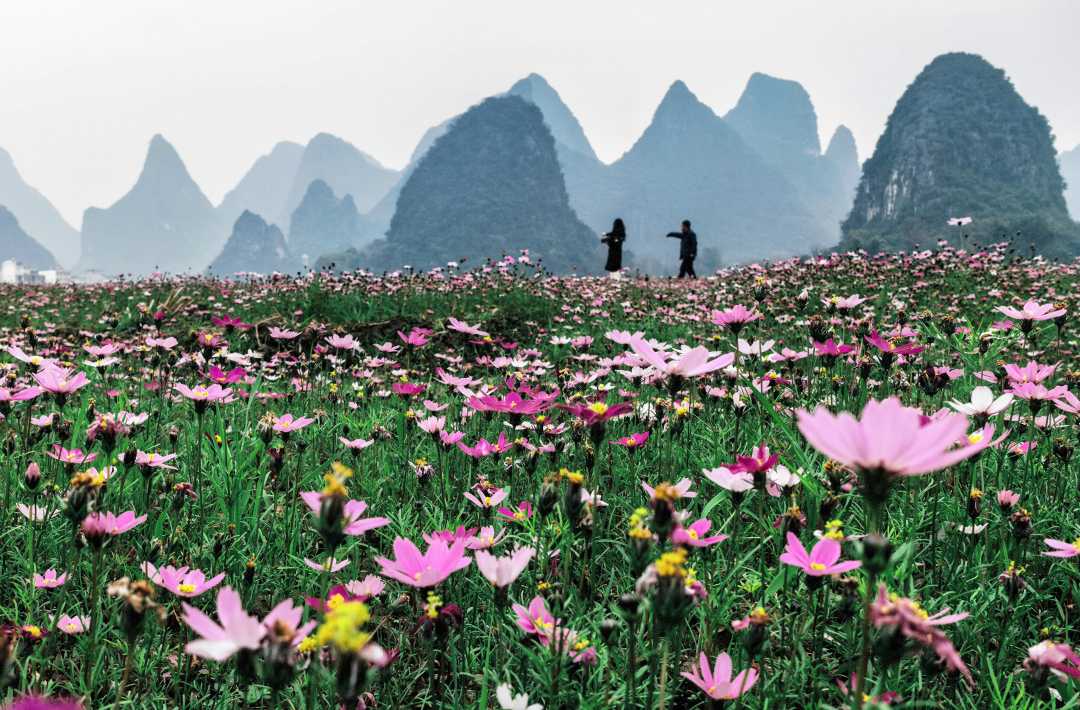 2月4日,广西壮族自治区桂林市临桂区四塘镇田心村,利用“冬闲田”种植的格桑花陆续绽放,与远处喀斯特地貌的峰林相映成景。