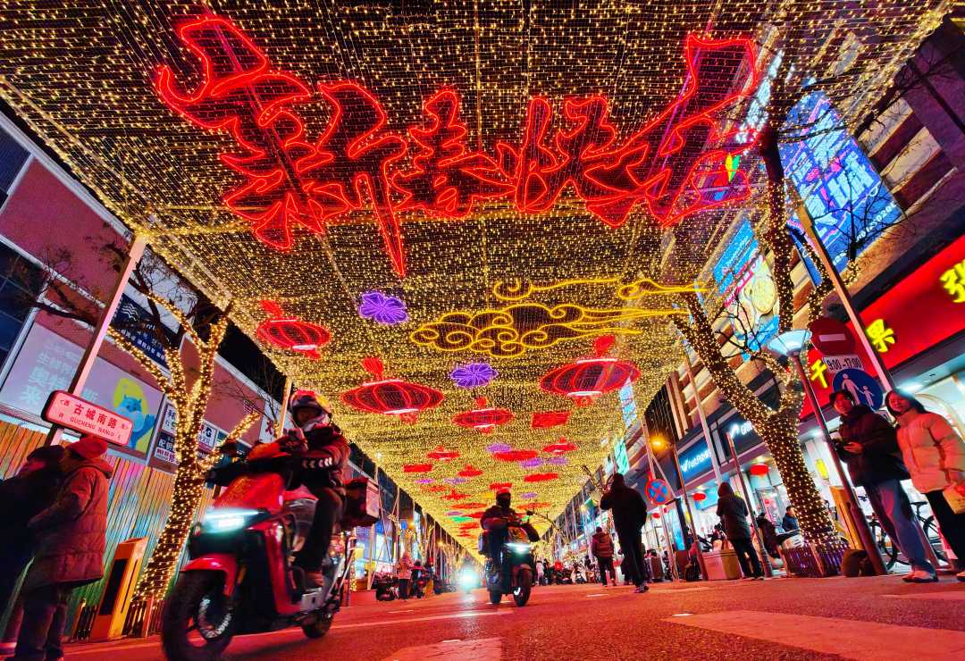 2月1日,北京市石景山区古城南路步行街迎新春彩灯璀璨亮丽,吸引市民观赏拍照。