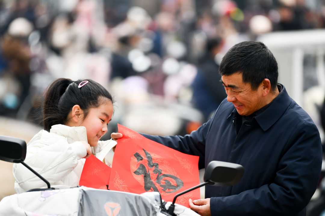 2月5日,江苏省泰州市凤凰小学教育集团洪泽湖路校区,书法老师为学生和家长现场书写春联和“福”字,迎接新春到来。