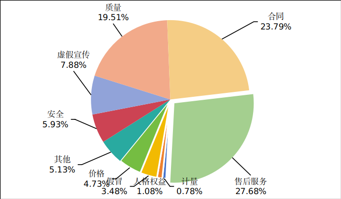 在所有投诉中,商品类投诉为1081511件,占总投诉量的53.63%,与2024年相比,比重上升4.4个百分点;服务类投诉为845710件,占总投诉量的41.94%,比重下降0.27个百分点;其他类投诉为89227件,占总投诉数量的4.42%。