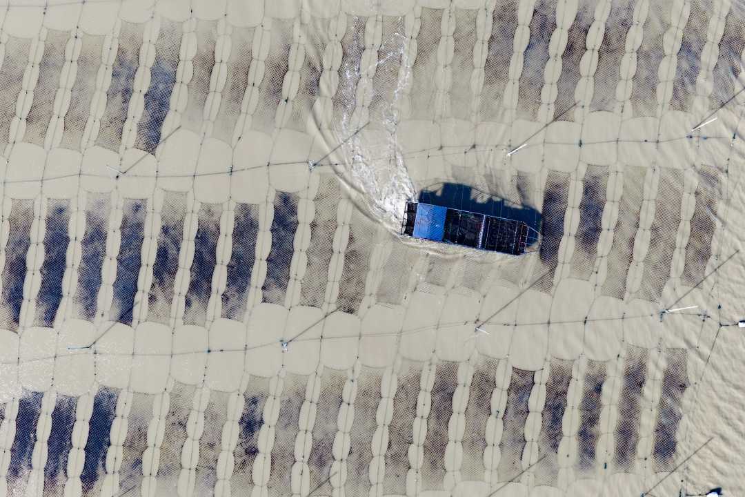 2月8日,江苏连云港市海州湾渔场养殖区,渔民驾驶渔船管护紫菜。