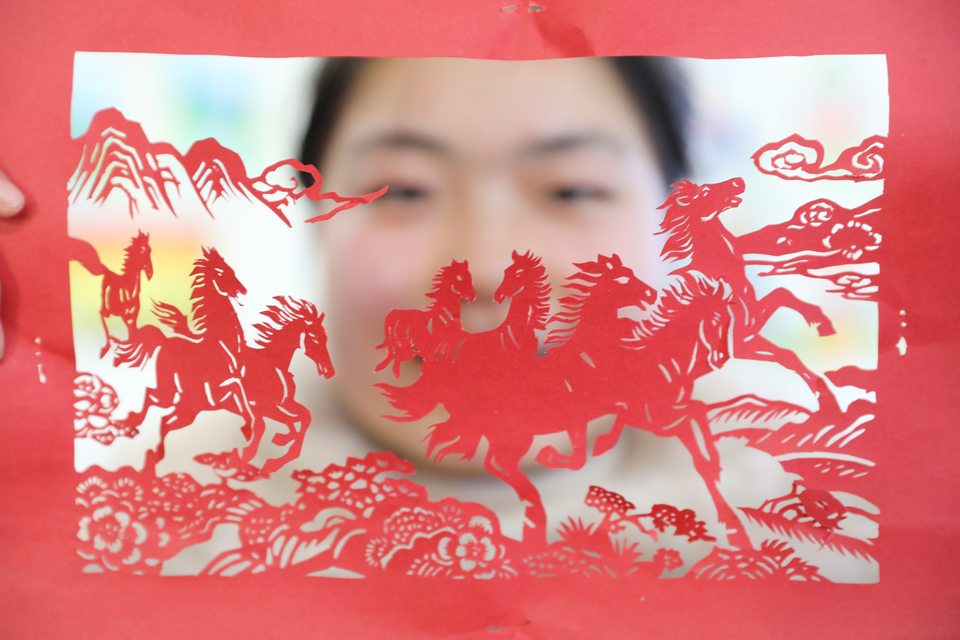 2月8日,河南省焦作市温县一名中学生在展示自己制作的生肖主题剪纸作品。