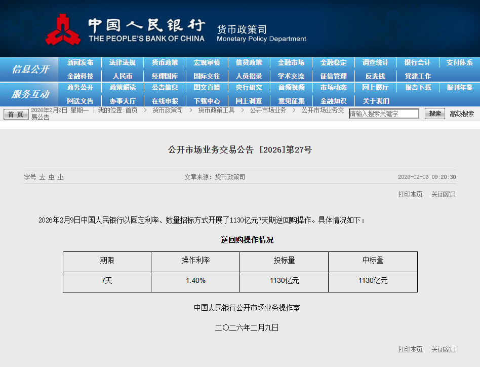 据央行官网消息,2026年2月9日中国人民银行以固定利率、数量招标方式开展了1130亿元7天期逆回购操作。具体情况如下: