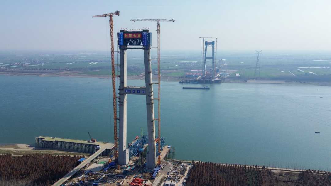 大桥两岸主塔均采用门型框架结构,北岸主塔高215.5米,南岸主塔高220.5米,均由塔座、38节塔柱、中横梁、上横梁及支墩组成。作为未来大桥的“脊梁”,它们将通过无数根钢索,稳稳承载起全长1723米、主跨达1120米的桥面,让汽车、高铁与城市车流在50米高空并行穿梭。