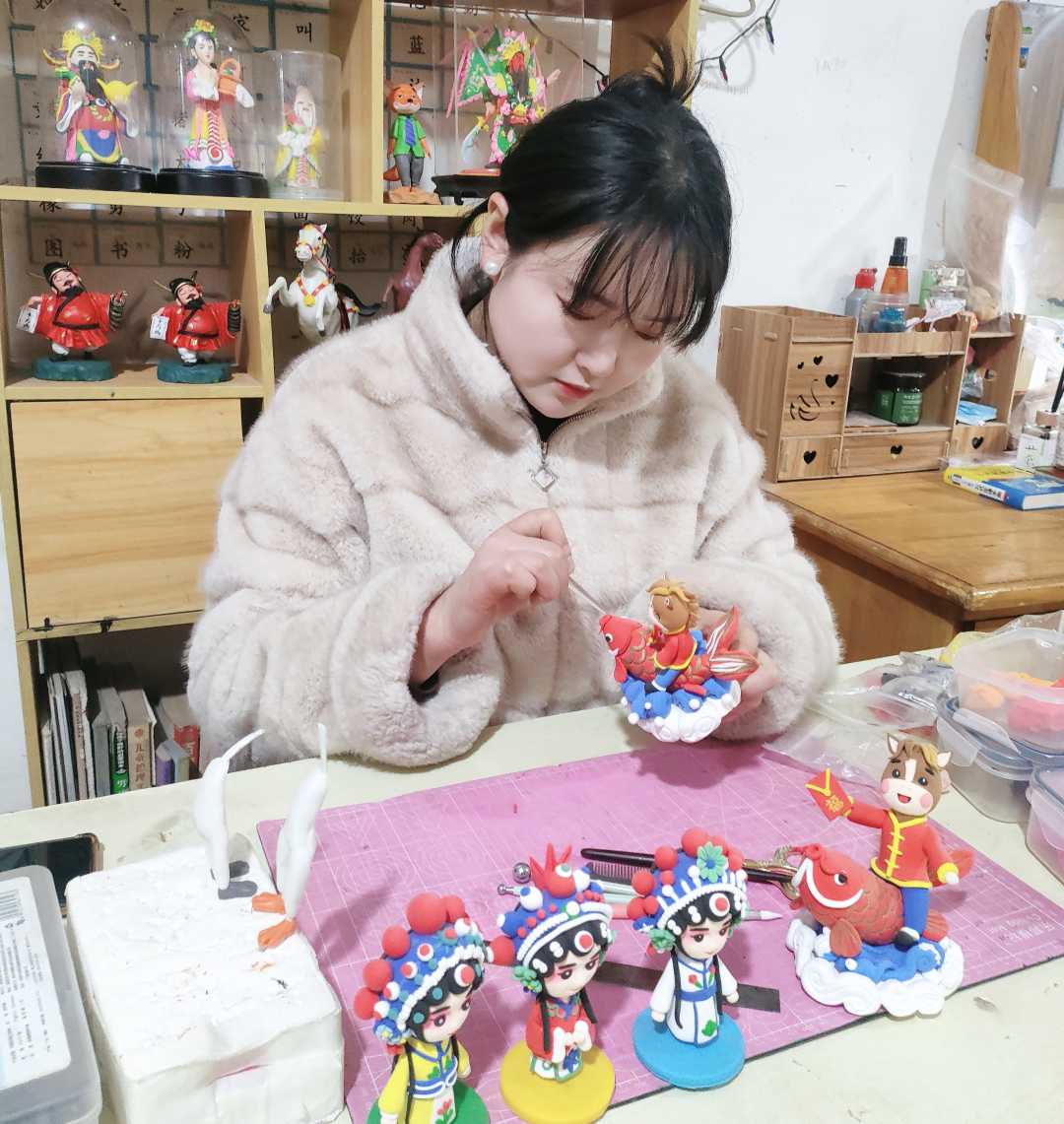 同为“90后”的姜亚男则是“胡氏面塑”的传承人,胡氏面塑主要以做传统的生肖、神话人物等为主,造型简练生动、形象逼真传神、比例夸张适当、色彩艳丽单纯,具有浓厚的民间风味。为让更多的人了解胡氏面塑,姜亚男经常在微信、抖音等账号上发布一些自己制作面塑的视频,吸引了众多粉丝关注,把手工面塑销往了全国各地。