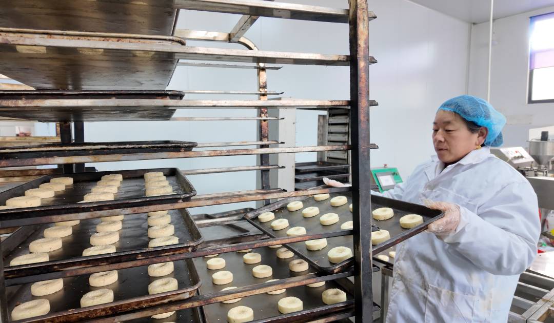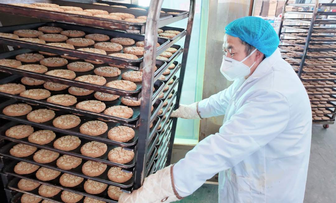 范县张庄镇杨家糕点非遗工坊内,工人将成型的桃酥饼胚摆上烘烤架。李博摄