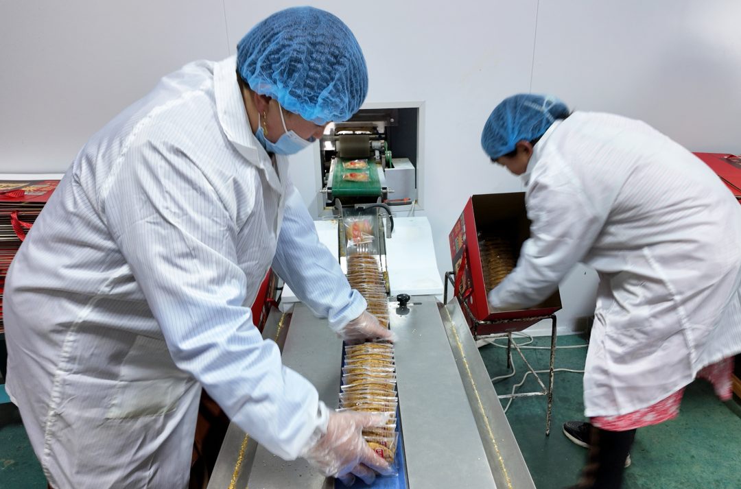 范县张庄镇杨家糕点非遗工坊内,工人将独立密封的桃酥进行装箱。李博摄