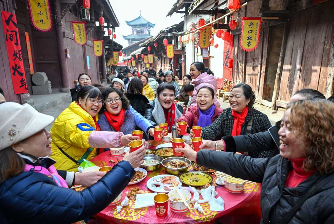 2月10日,四川省南充市蓬安县周子古镇举行老街坊联谊“坝坝宴”,社区居民欢聚一堂共叙邻里情,喜迎新春佳节。