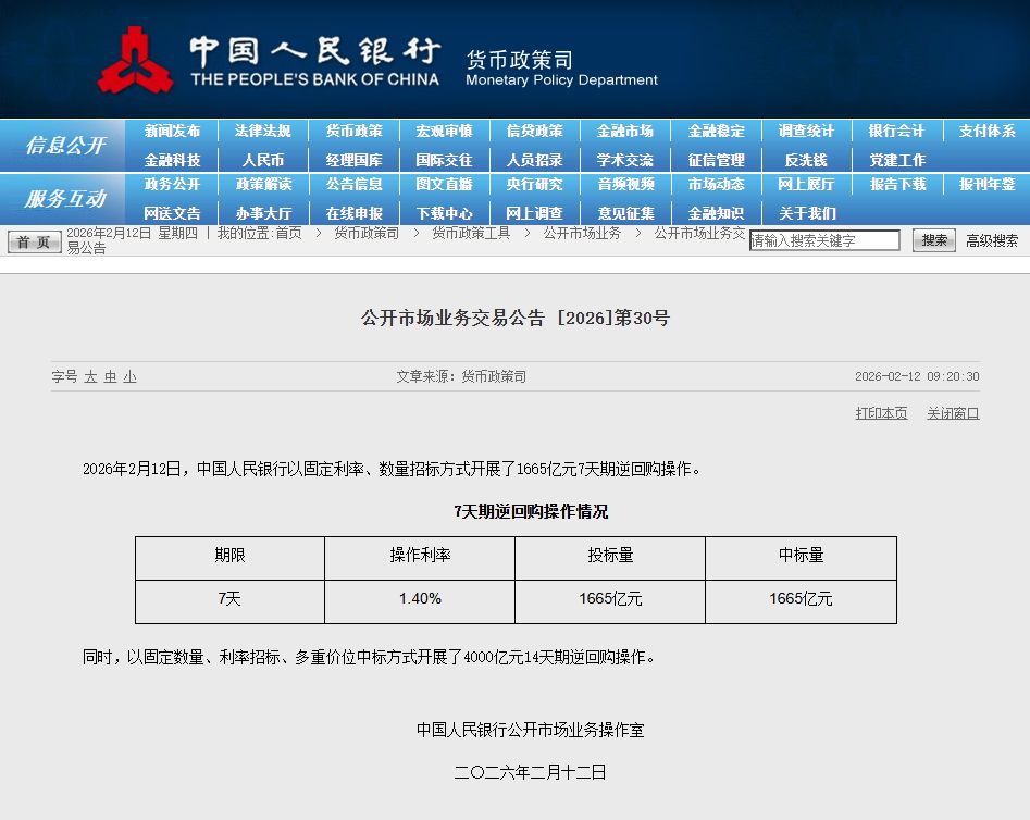 据央行官网消息,2026年2月12日,中国人民银行以固定利率、数量招标方式开展了1665亿元7天期逆回购操作。同时,以固定数量、利率招标、多重价位中标方式开展了4000亿元14天期逆回购操作。