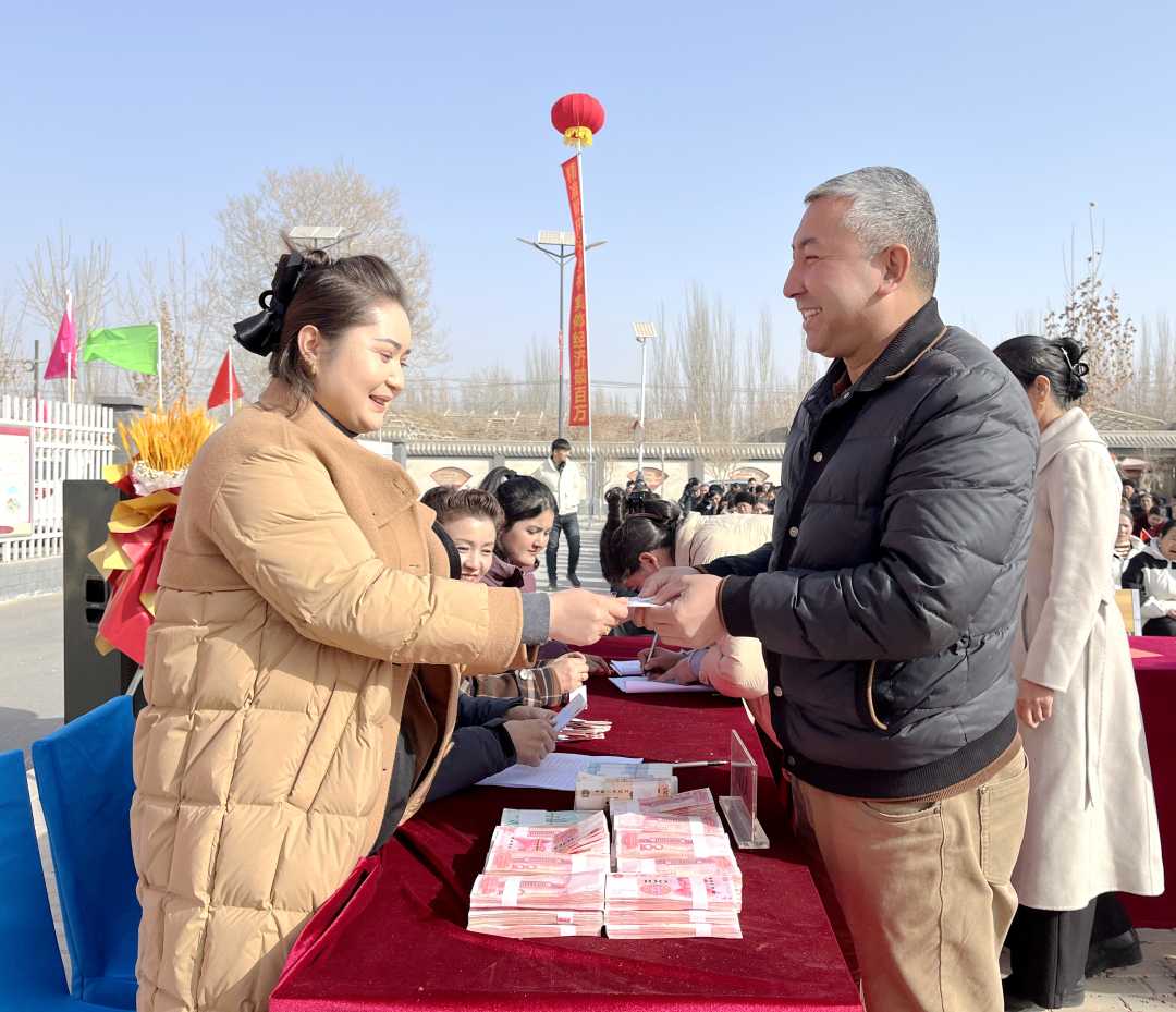 2月11日,新疆和田地区和田县罕艾日克镇罕艾日克村火车头文化广场上喜气洋洋,中国铁路乌鲁木齐局集团有限公司定点帮扶的罕艾日克村村集体收益分红仪式在此举行,313户村民领取了32万元村集体经济分红款,共同见证了新疆铁路定点帮扶结出的丰硕成果。