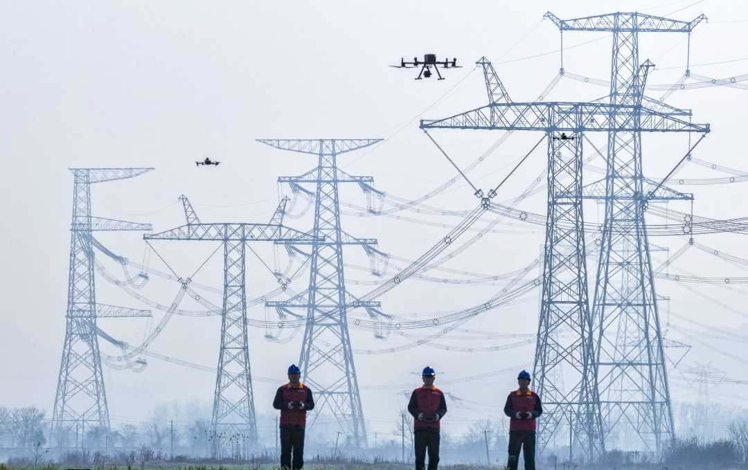 2月11日,安徽省芜湖市繁昌区孙村镇,国网芜湖供电公司工作人员利用无人机对输电通道开展巡检,保障用电安全。