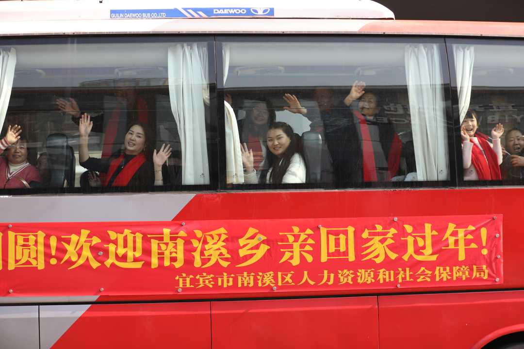 2月11日,四川省宜宾市开展宜宾籍农民工“温暖回家路”系列活动,包车护航农民工回家过年。在宜宾站广场,返乡农民工及家属,向前来接站的工作人员挥手致意。