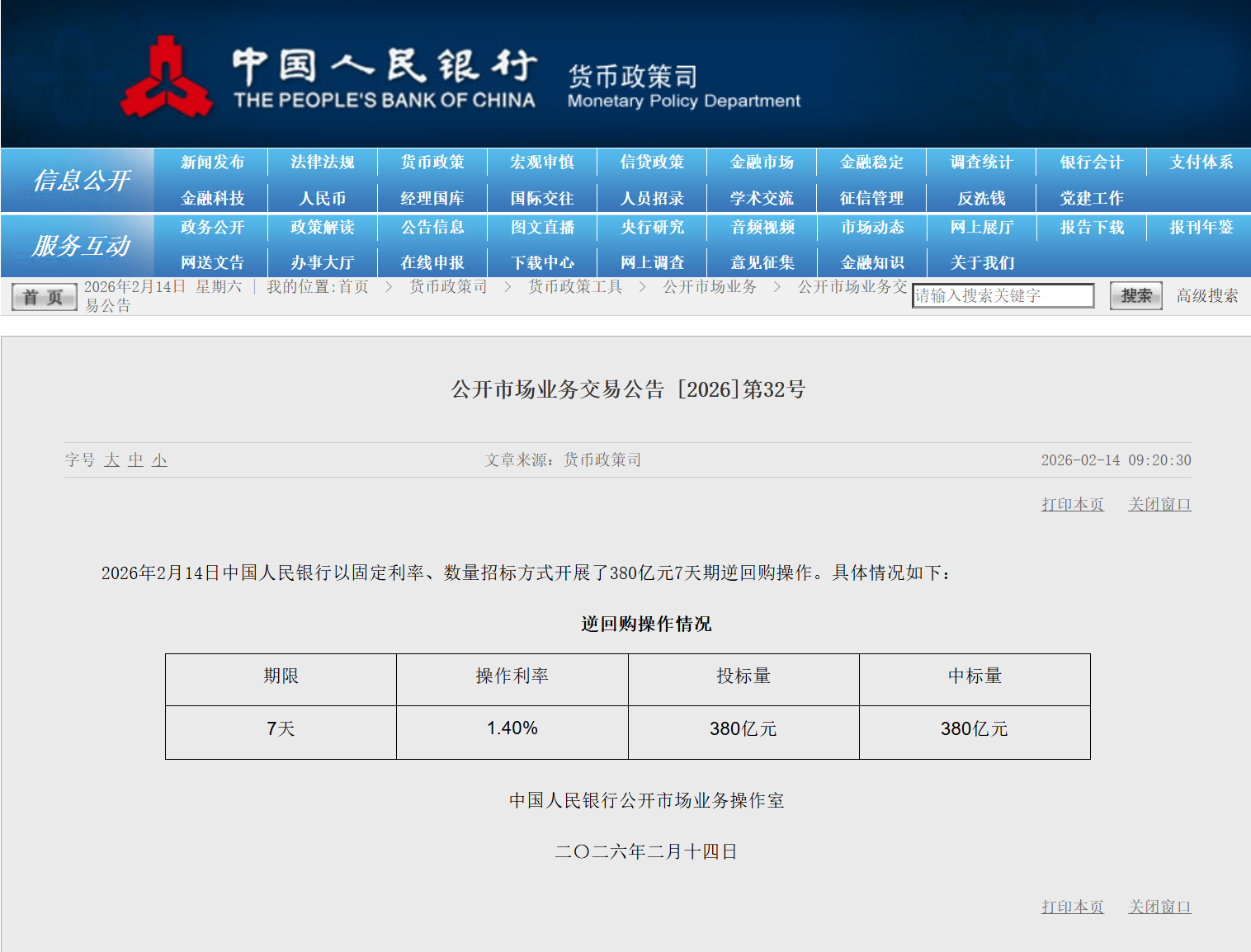 据央行官网消息,2026年2月14日,中国人民银行以固定利率、数量招标方式开展了380亿元7天期逆回购操作。具体情况如下: