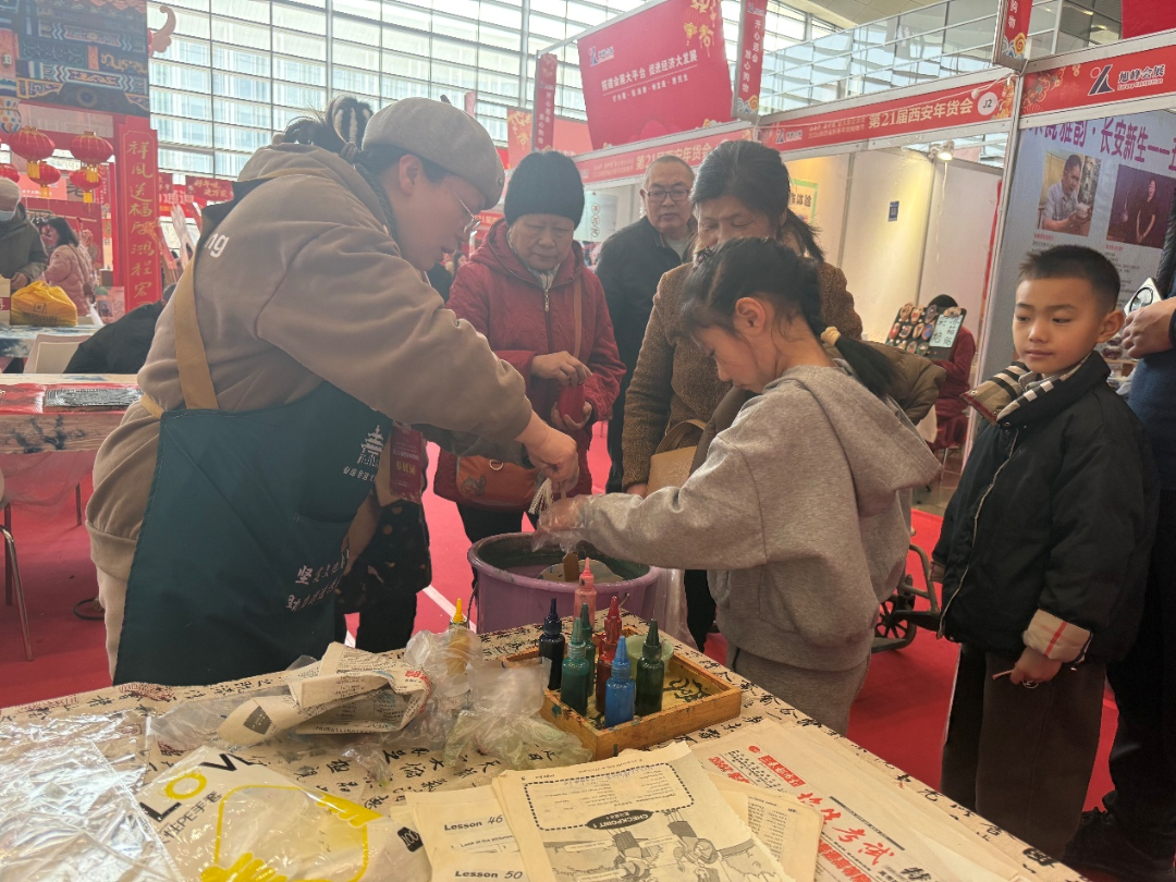 第21届西安年货会非遗国潮体验区,人们正在体验漆扇制作。 雷沛云 摄