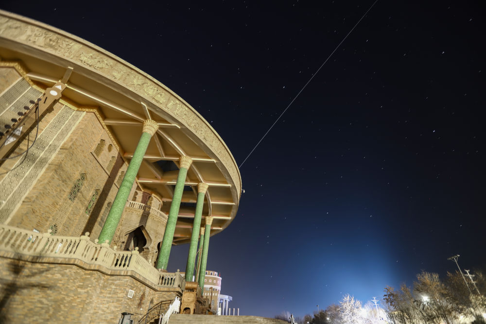2022年12月28日,在新疆哈密拍摄的中国空间站飞过哈密木卡姆传承中心。新华社发 (王俊峰摄)