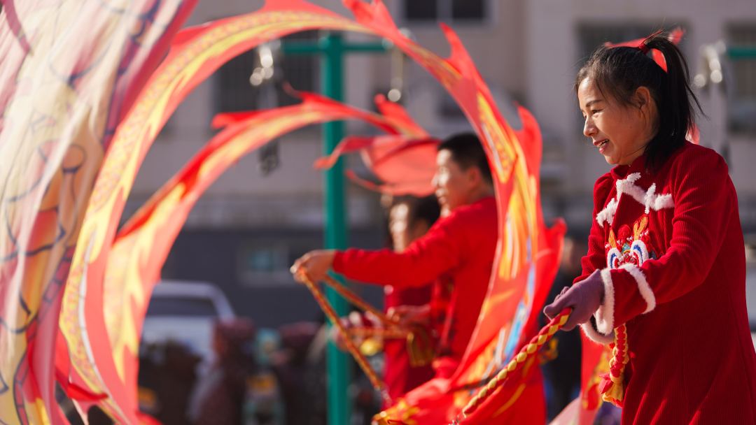 2月16日,山东省邹平市高新街道君和社区居民一起舞彩带龙,过大年。