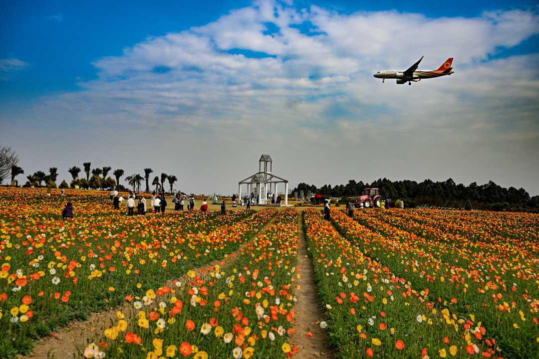 2月15日,游客在成都市双流区空港花田打卡赏花,一派春意盎然景象。