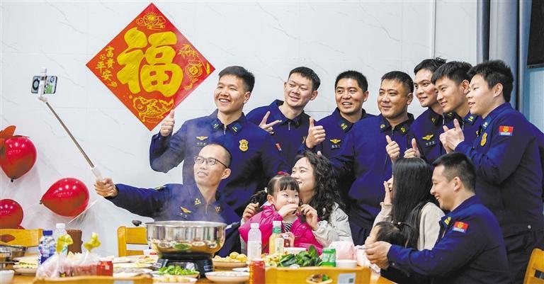 2月16日,在江苏省泰兴市澄江西路消防救援站,消防员们和家人在一起吃年夜饭。 杨玉岗摄(中经视觉)