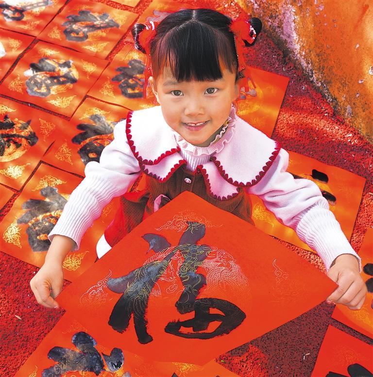 2月14日,重庆市酉阳土家族苗族自治县天馆乡,小朋友在送春联活动中展示“福”字。石嘉黎摄(中经视觉)