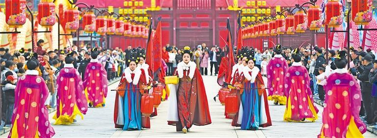 2月16日,在河南省洛阳市隋唐洛阳城国家遗址公园九洲池景区,游客在观看表演。黄政伟摄(中经视觉)