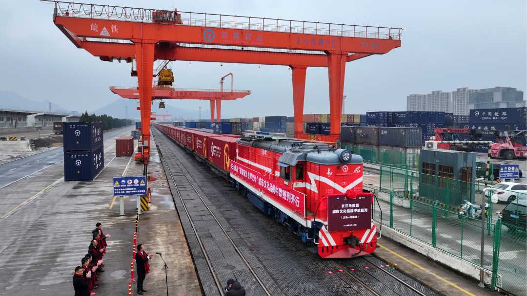 2月17日上午10时,浙江义乌铁路口岸,一列满载110个标箱、统一喷涂有“有情有义 世界义乌”城市文化品牌标识的中欧班列,从铁路义乌西站启程,满载着义乌市场畅销的小福马等马年文创产品等商品,经新疆阿拉山口口岸出境,驶往西班牙首都马德里。