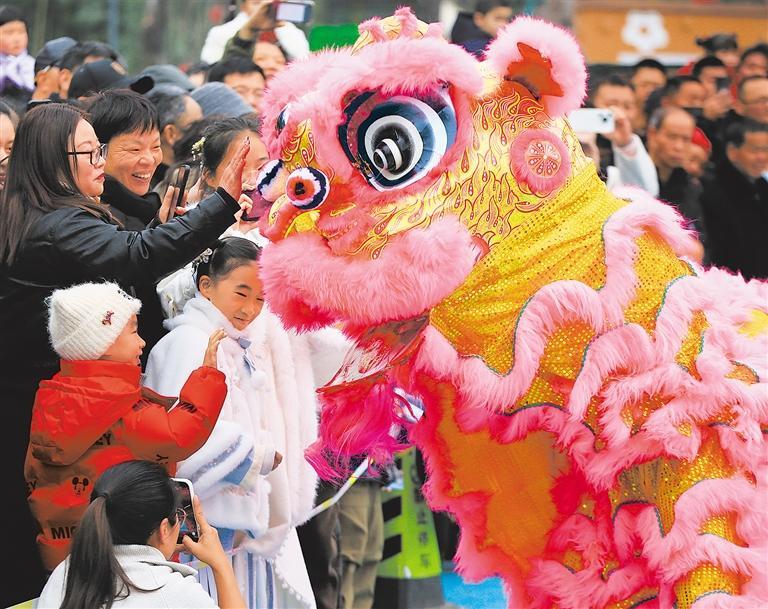2月17日,浙江省温岭市锦屏公园,市民游客与舞狮互动。