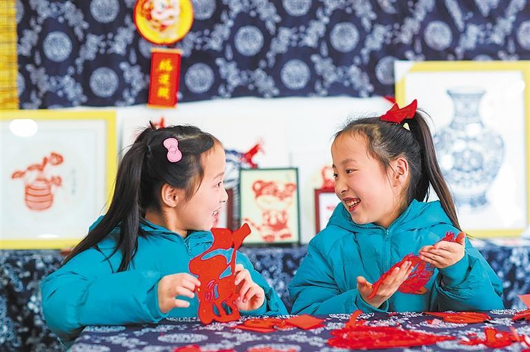 2月14日,江苏省兴化市垛田街道乡村非遗艺术馆,孩子们在创作“马”主题的剪纸。