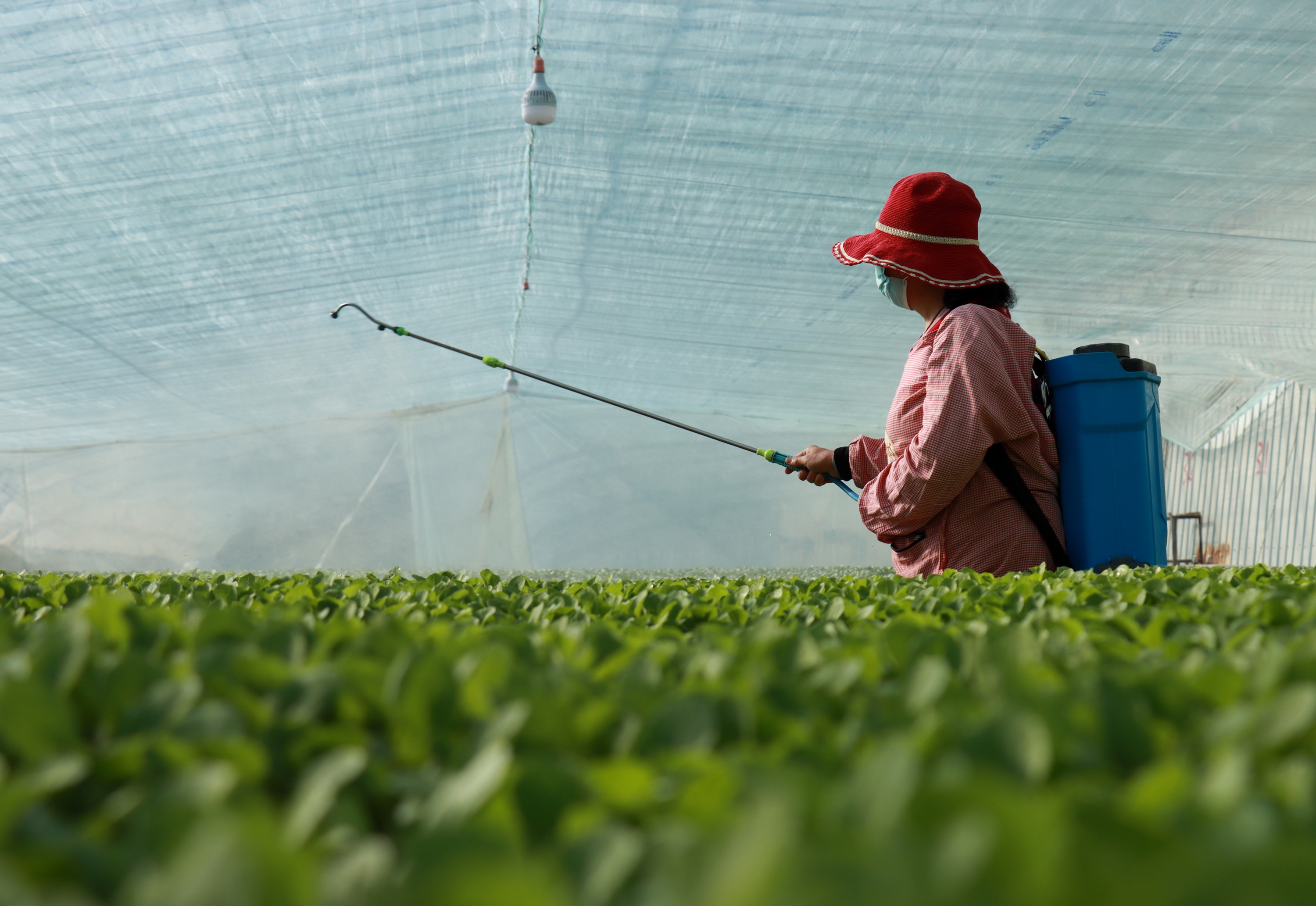 2月18日,河南省安阳市内黄县马上乡一育苗厂,农民在大棚内管护白菜苗。